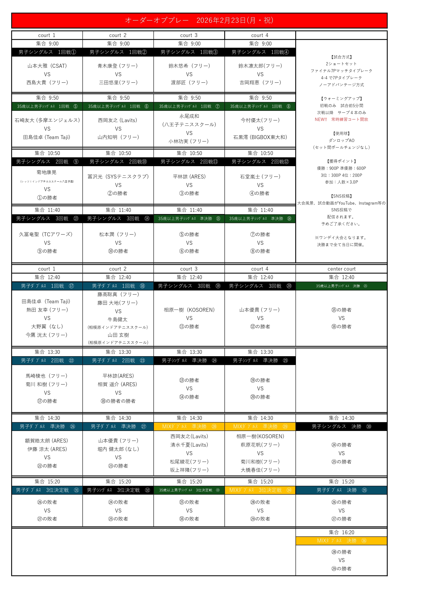 ※進行状況により、順番やコート番号が入れ替わる場合がございます。